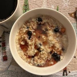 #breakfast. Not that I'm sick of bread or anything, but I'm trying to branch out a bit, eat healthier and get a bit more fiber in my diet. Morning oatmeal with fruit and a drizzle of fruit syrup for a touch of sweetness is on the menu these days. Great, though I might need to research oatmeal toppings and mix it up soon.