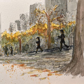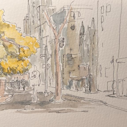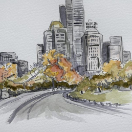 squwetchy Watercolour urban sketch of Central Park in November, looking south. Painted from a photo that was taken in the rain. #newyork
