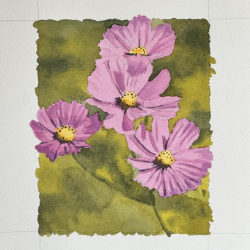Week four of my #watercolour class and we dug into some interesting new techniques for this elaborate people flower. Some lifting and some layered/blending washes had some interesting optical effects related to what goes the illusion of transparency on the petals. I have been pushing in the boundaries of my backgrounds for all the pieces I’ve completed for this class …which was above and beyond to the assignment, and just something I’d seen done online. The instructor really likes it tho and has been ribbing me and calling it The Brad Technique and some of my fellow students have started to imitate it.