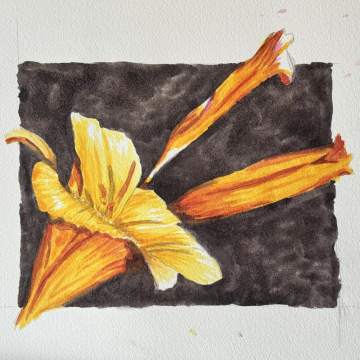 Apart from the small paint splatter accident mid way thru, my #watercolour #flower painting homework for week two turned out better than I’d expected. to be honest, I didn’t really like this picture when he showed it to us last night and the results that he got were a little flat and uninspired for my own personal tastes, which has less to do with the artistic quality and more to do with the lesson that was being forwarded in our second class. I tried to duplicate the results as best as I could, and then soften the background a little bit more than he had in his original piece, which was a fairly abrupt matte black. Watercolour flowers week 2 homework used about fifty bucks* worth of yellow paint but the results seem worth it. *tho not really