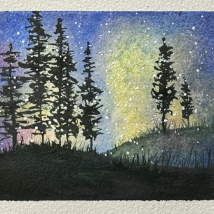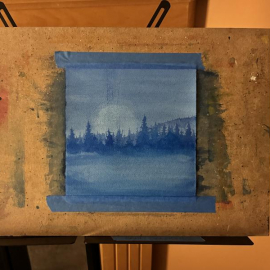 I did some unplanned meditative painting last night before bed. Just put on an audiobook, watered down some blue paint, and starting with a wash and some selective lifting just let my imagination go wild. I have been a little bit fascinated with the idea of ethereal forests emerging from the soft wet-on-wet blur of layering washes of tree silhouettes and this is a good example of how that can blossom into something interesting by simply adding carefully layered tree textures over and over into a still-damp paper. The trees sort of soften into each other as you work and then you go back over them to build up colour value later by layer. I was just mucking around here mostly but even as I worked I kind of regretted not going about it in a more planned way because the result was actually materializing for me. Sadly, my iphone is a little weak in photographing such nuance and it keeps trying to amplify the textures and grain of the paper, inflating the contrast that is not there as strongly when you are looking at this in real life. There photo does not do it justice.