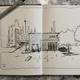 Today’s sketch was brought to you by being blocked in at the Starbucks parking lot by a delivery truck and settling in to do a little view of the pizza restaurant out the window. Urban sketching, more like #suburbansketching